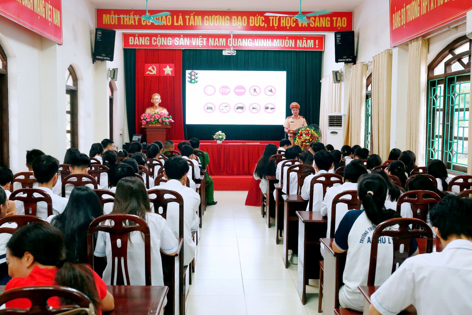 Hưởng ứng “Tháng cao điểm an toàn giao thông cho học sinh đến trường”, nhằm nâng cao kiến thức, ý thức trách nhiệm, kỹ năng tham gia giao thông an toàn và ứng xử văn hoá khi tham gia giao thông cho học sinh nhà trường, góp phần giảm thiểu vi phạm pháp luật về bảo đảm trật tự ATGT, tai nạn giao thông và ùn tắc giao thông, sáng ngày 22/9/2025, Trường THPT A Phủ Lý đã phối hợp với Công an phường Phù Vân tổ chức chương trình tuyên truyền giáo dục pháp luật về an toàn giao thông cho học sinh năm học 2025 – 2026.