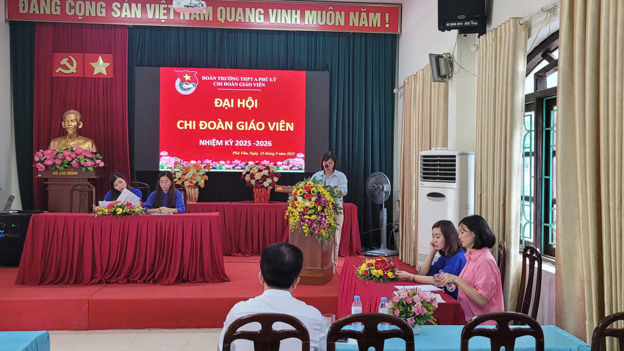 Thực hiện Chương trình công tác Đoàn và phong trào thanh niên năm học 2025 – 2026, được sự chỉ đạo của Đảng uỷ và Đoàn trường THPT A Phủ Lý, chiều ngày 25/9/2025, Chi đoàn Giáo viên đã long trọng tổ chức Đại hội Chi đoàn nhiệm kỳ 2025 – 2026. Đại hội là dịp để tổng kết, đánh giá kết quả hoạt động trong nhiệm kỳ vừa qua, đề ra phương hướng nhiệm vụ trong nhiệm kỳ tớiđồng thời bầu ra Ban chấp hành có đầy đủ năng lực toàn diện để đưa Chi đoàn giáo viên ngày càng vững mạnh.