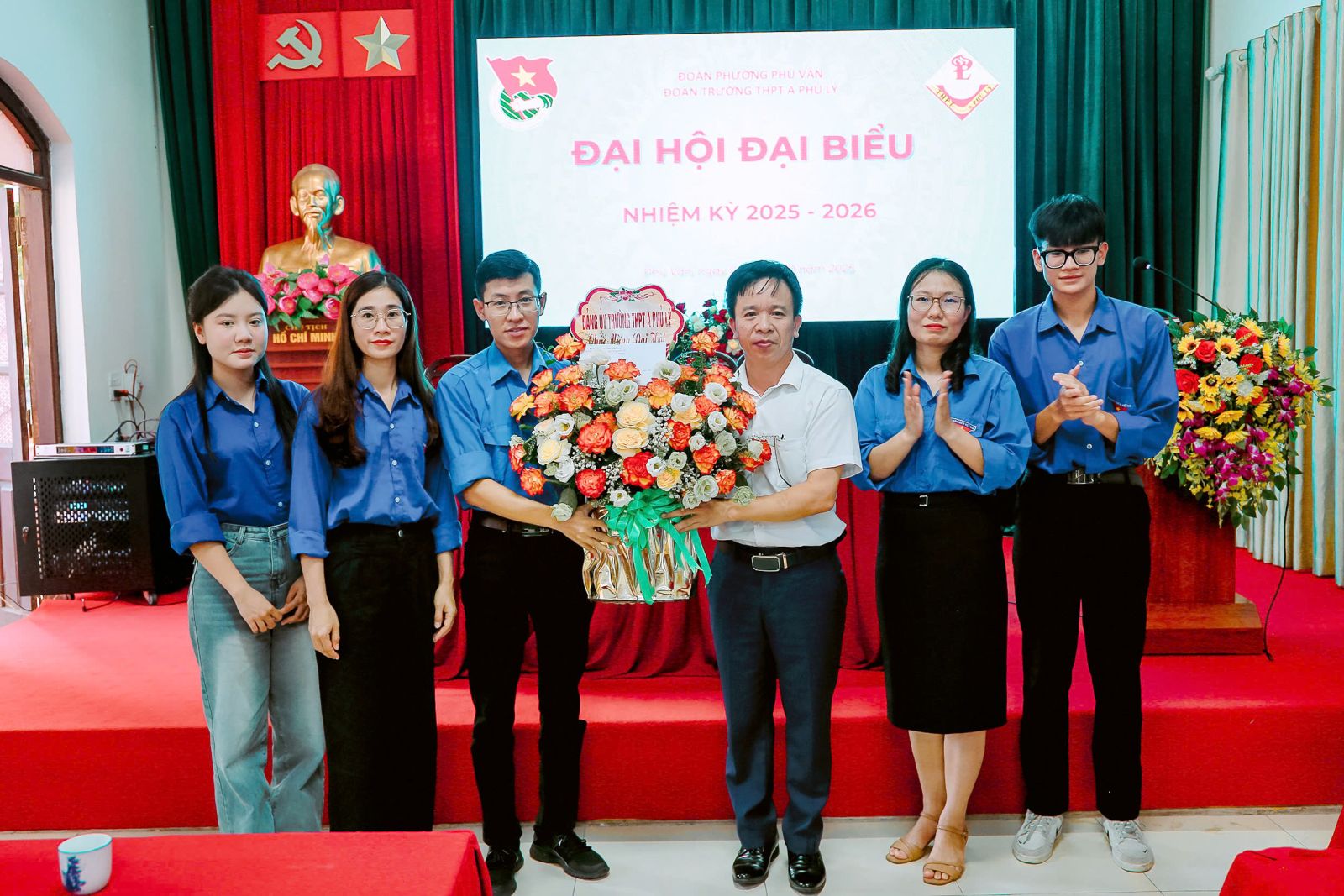 Thầy Lương Văn Dương – Bí thư Đảng bộ, Hiệu trưởng Nhà trường tặng hoa chúc mừngVề dự Đại hội, về phía Đoàn phường Phù Vân, có đồng chí Hoàng Văn Toàn – Đảng ủy viên, Phó Chủ tịch Uỷ ban MTTQ Việt Nam phường, Bí thư Đoàn phường; Về phía Đảng uỷ – lãnh đạo nhà trường, có thầy Lương Văn Dương – Bí thư Đảng bộ, Hiệu trưởng Nhà trường, cùng các thầy cô trong Đảng ủy, Ban lãnh đạo trường THPT A Phủ Lý. Đặc biệt là sự có mặt của 72 đoàn viên ưu tú là đại biểu chính thức cũng về tham dự Đại hội.