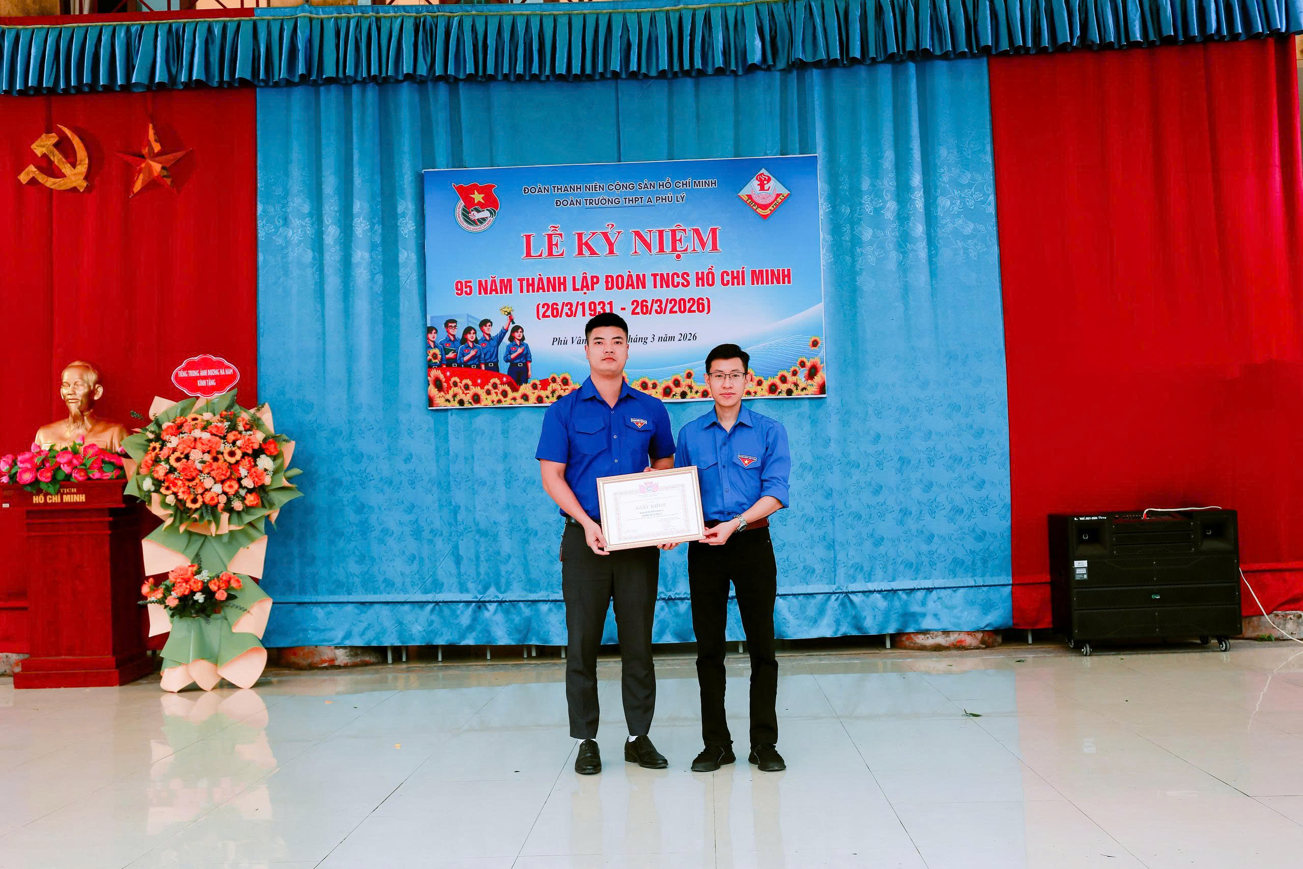 Đ/c Hoàng Văn Toàn – Bí thư Đoàn phường Phù Vân trao tặng Giấy khen thành tích xuất sắc cho Đoàn trường